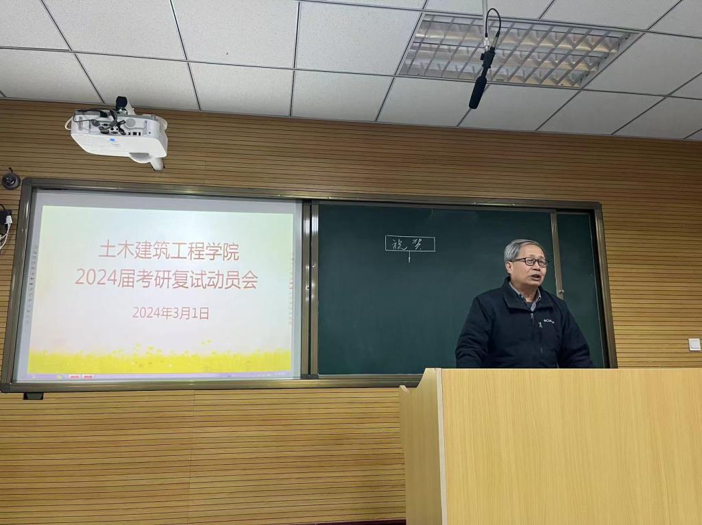 为助力土木建筑工程学院2024届考研考生顺利通过研究生复试,3月1日上午,土建学院在B407教室举办2024届考研复试动员会。副院长黎莹、校督导专家凌伟、学院教工党支部书记郭秀琴、建环专业负责人白梦梦、毕业班辅导员张庆莹、文都考研复试辅导名师王钰、2024届全体考研上线同学参加会议。动员会由学工负责人李辉主持。