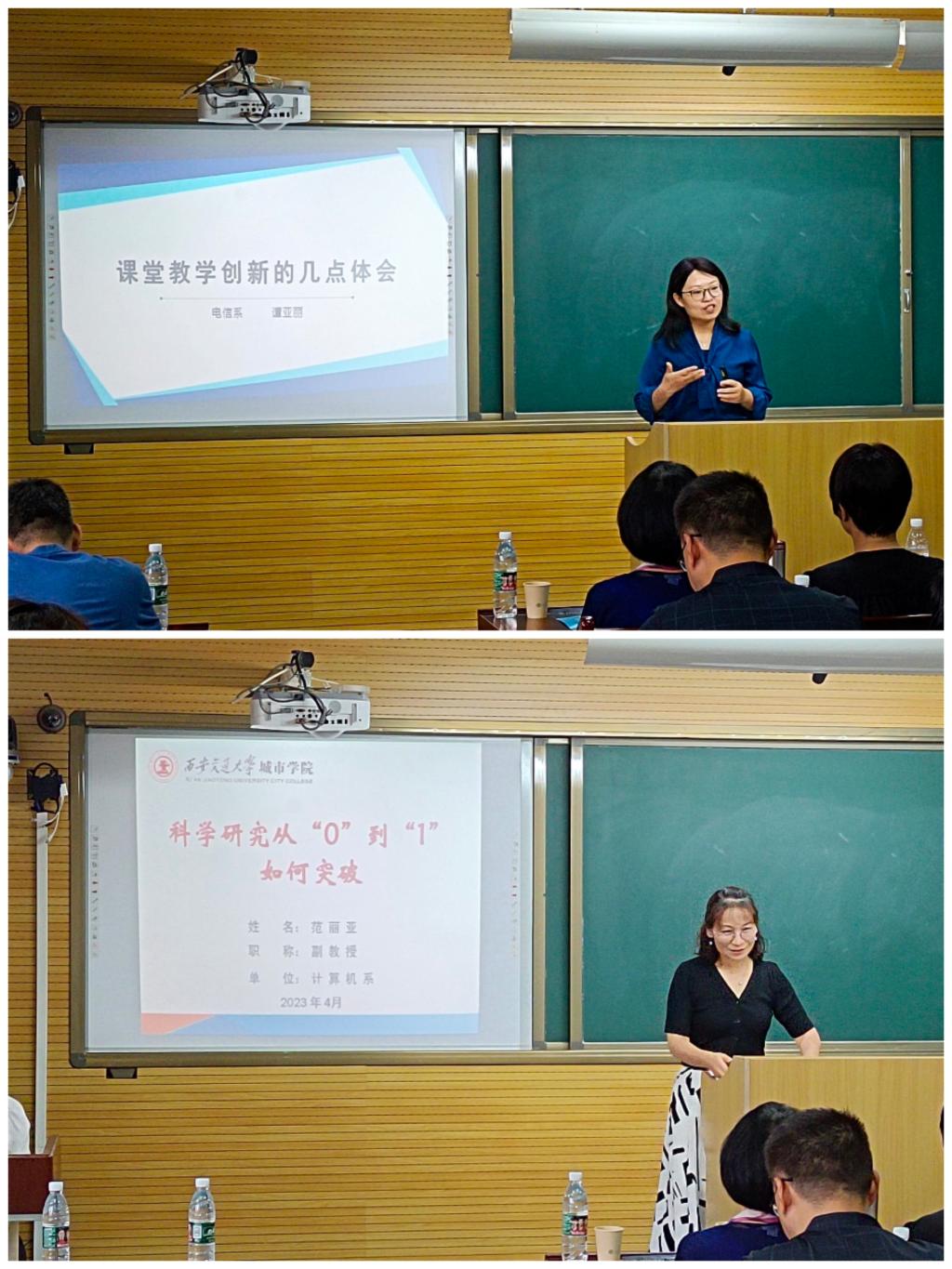 随后,电信系谭亚丽以《课堂教学创新的几点体会》为题,结合自身进行的教学创新,深刻阐释了教师对于教学要做到奔赴热爱、坚持不懈、勇于创新、取长补短、同心协力;计算机系范丽亚以《科学研究从“0”到“1”怎么突破》为题,以自身科研成长道路为媒,分享了科研突破的过程、方法、路径以及经验;土建系黎莹交流了《土力学》线上线下混合式教学的方法、内涵、设计、效果评价以及创新特色;土建系张瑜分享了《BIM设计创新实验》的课程建设及成果展示;土建系白梦梦进行了《分体式空调制冷原理》的课堂教学展示。