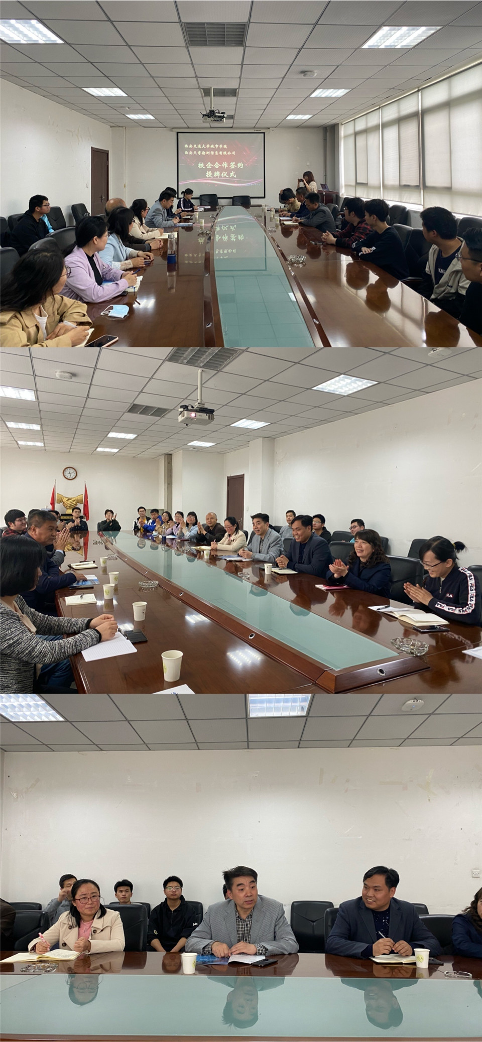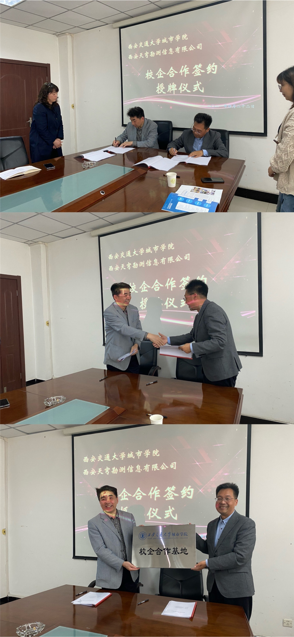 4月22日下午,西安交大城市学院土木建筑工程系与西安天穹勘测信息有限公司在行政楼508会议室举行校企合作签约及授牌仪式。西安天穹勘测公司总经理周强、测绘地信总工程师高振军、文化遗产数字中心主任李俊龙,学院副院长朱旭、综合办主任兼保卫部部长陈涛、土建系主任助理黎莹以及专业教师和学生代表参加会议,本次会议由土建系主任助理康彦青主持。