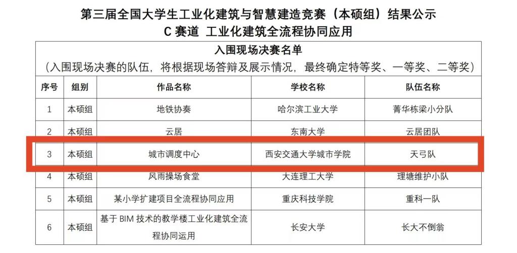 大赛开设绿色低碳与智能审查应用、装配式建筑设计生产与施工、工业化建筑全流程协同应用三大赛道,三大赛道共有500多支队伍2100余名师生报名参赛。西安交大城市学院土木建筑工程系组织6支代表队参加比赛,参赛师生通过不懈努力,最终由戴世安老师指导的队伍入围C赛道决赛,9月9日上午同哈尔滨工业大学、东南大学、中国矿业大学、大连理工大学、长安大学、辽宁工业大学等高校同台竞技。经过激烈现场答辩后,我院最终获得二等奖一项、优秀组织奖一项,展现了城院学子扎实的基础知识和专业技能、良好的创新意识和团队协作能力。