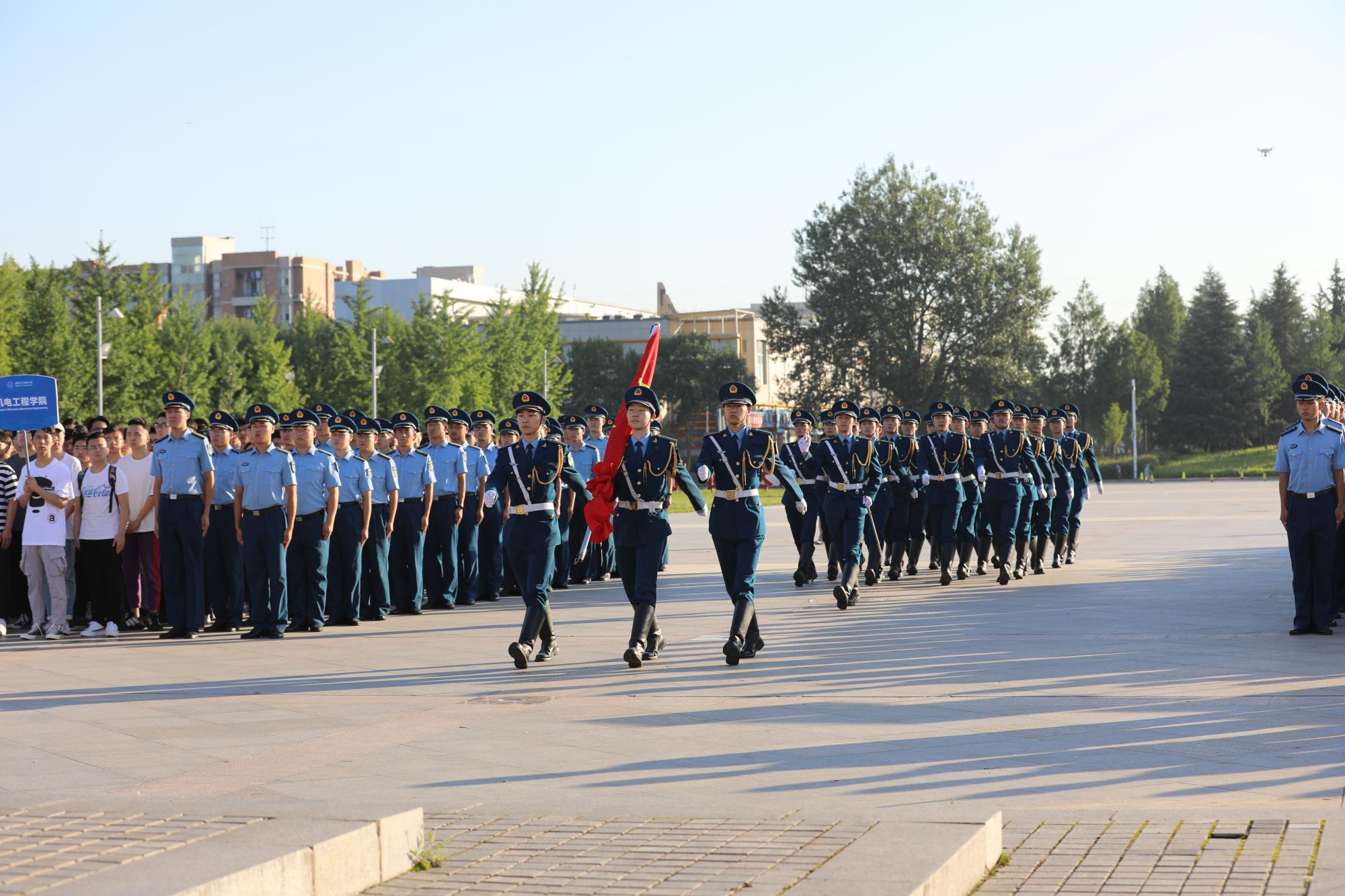早7时整,在参加仪式的全体师生党员肃立注目下,国旗护卫队迈着整齐矫健的步伐,护送国旗走向升旗台