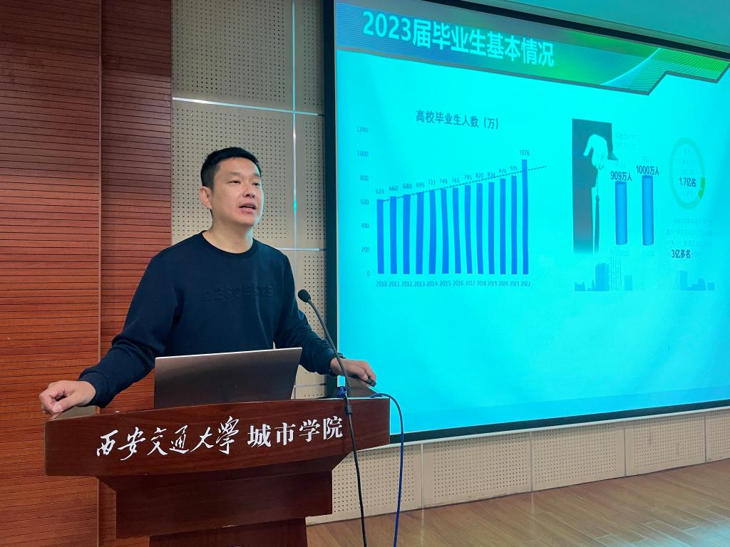 首先,牛彦龙老师结合当前全国大学生就业形势、环境、背景,以及上级部门在促进大学生全方位、高质量就业方面的有关精神和要求,分析报告了土木建筑工程系2023届毕业生在就业过程中可能遇到的压力与难题,毕业生在当前秋季招聘期间的行动表现和签约企业情况,以及个别毕业生在就业过程中存在的责任心和态度问题,并针对问题给同学们提出改进方法与实现途径。同时,介绍了2023年研究生招考与公考、事业编考试形势,为满足同学们个性化就业需求,牛彦龙老师还对大学生应征入伍,大学生志愿服务西部计划、“三支一扶”等基层就业项目,自主创业等就业政策进行了详细的解读和说明,并对各项目的报名条件、优待政策及适合群体进行了解析,引导符合条件的毕业生积极响应国家政策,前往基层服务积极寻求个人新的发展方向。