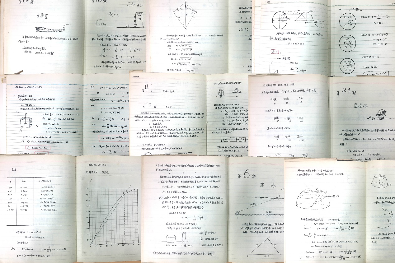 梁教授的笔记不仅字迹工整,而且极富生活情趣,他手稿中的手绘插画堪称一绝。在每个笔记的封面上,都配有亲手绘制的插画、插图。梁教授信心满满得讲到,他手绘的每一幅插画都是别出心裁的。说着,他随手拿出上世纪70年代的《铁氧体移相Ⅱ》这本笔记,向大家介绍封面上手绘的是国内第一台“铁氧体移相器”,他详细地向大家分享这个器件的设计背景以及相关的数据。仔细翻看梁教授的笔记,每一本笔记都趣味盎然。1972年手写的Mathematics是一本习题集,里面手写了30道数学题,每一道数学题都配有一副精美的插画,这些插画不但富有设计感,而且细致入微。他用五分钱硬币讲述齿轮传动,画的栩栩如生。