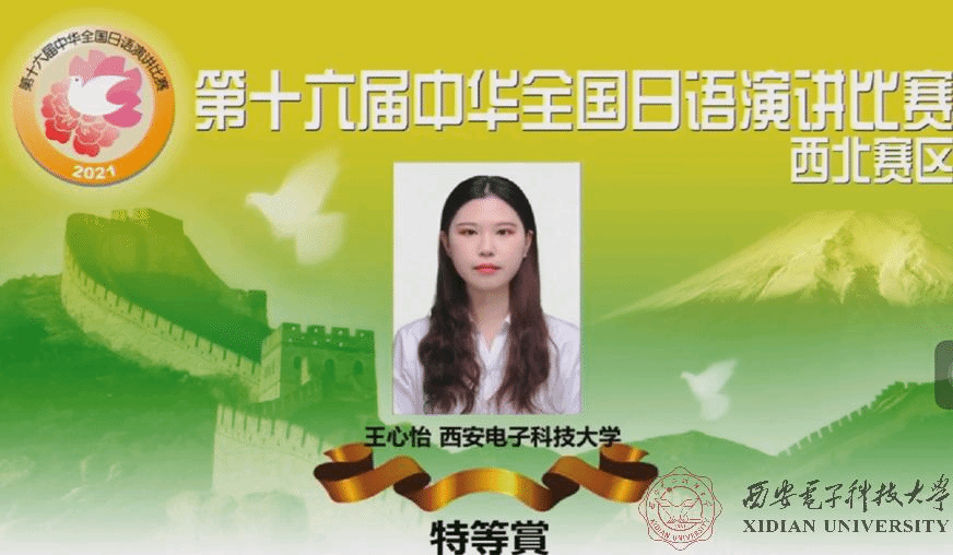 本次西北赛区预赛,共有来自陕西、山西、甘肃、青海、宁夏、新疆6省区31所高校的31名选手参加。大赛赛程分为限时5分钟的命题演讲与限时3分钟的即兴演讲两部分,命题演讲以“新冠抗疫给我的启示”、“如果我能穿越时空”为主题,即兴演讲以最近的时事话题为主。最终,王心怡同学凭借地道流畅的日语表达、条理清晰的演讲内容、沉着冷静的临场表现脱颖而出,赢得了现场评委的一致好评,以总分第二名的成绩获得特等奖,并将代表西北赛区参加全国总决赛。