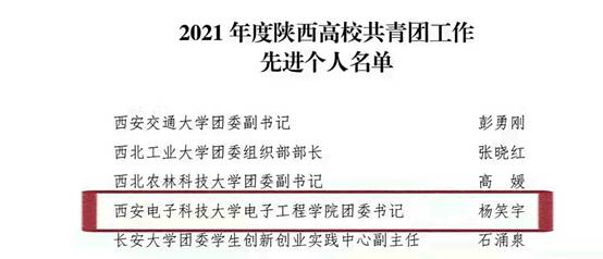 (通讯员 尹鹏王佳悦)近日,共青团陕西省委下发《关于表彰2020-2021年度“陕西省优秀共青团员”“陕西省优秀共青团干部”及“陕西省五四红旗团支部”“陕西省五四红旗团委”的决定》《关于2021年度陕西高校共青团述职评议考核结果的通报》,对2021年度陕西省共青团系统优秀单位及个人进行表彰。BB贝博艾弗森原官方网站团委荣获2021年度陕西高校共青团工作优秀单位,校团委书记傅超荣获“陕西省优秀共青团干部”称号,电子工程学院团委书记杨笑宇荣获“陕西高校共青团工作先进个人”称号。