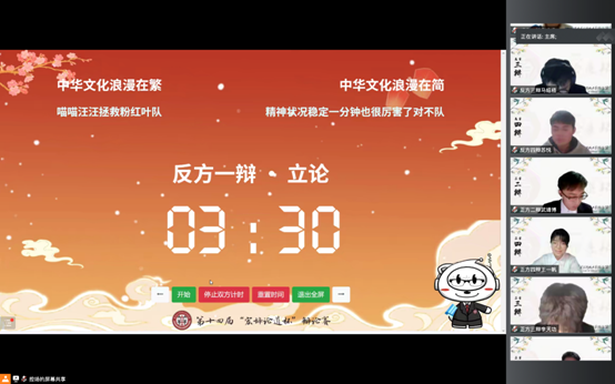 本次决赛,双方围绕“中华文化浪漫在繁/简”展开辩论,中国文化之浪漫,有陶渊明的归去来,也有苏东坡的赤壁风;有魏晋齐梁之瑰丽,也汉宋明清之质朴。双方同学在对中华文化繁简之别的剖析中探究文化浪漫特质的发轫。正方海棠3号书院代表队的同学提出中华文化内容繁多,情节曲折,了解的越多便越为文化背后浩如繁星的内涵所震撼,这是中华文化的浪漫之处。反方海棠4号书院代表队的同学则主张简明的描述、留白产生的幻想言有尽而意无穷,这些让人们想象的空间才是中华文化独有的浪漫之处。比赛过程中,双方同学从价值导向、评判意义等不同角度对各自立场展开论述,他们或慷慨激昂,或沉稳理智,用清晰的思路、缜密的表达、稳健的台风证明了自己的实力,共同奉献了一场精彩的比赛。