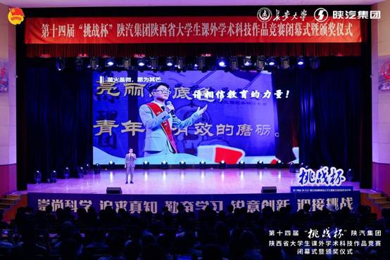 共青团陕西省委书记徐永胜在闭幕式上讲话,他指出,“挑战杯”竞赛自举办以来,始终坚持“崇尚科学、追求真知、勤奋学习、锐意创新、迎接挑战”的宗旨,在实施科教兴国战略、人才强国战略、创新驱动发展战略中发挥了积极作用。他认为,此次竞赛的成功举办,不仅为广大青年学生搭建了展示青春才华的舞台,也为大家提供了投身科创报国的良好平台。他勉励三秦学子胸怀梦想,积极投身科技创新和技术攻关一线。