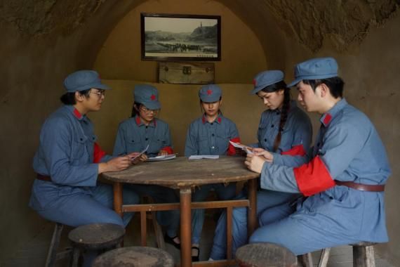 怀着崇敬之情,实践队走进中共中央书记处旧址枣园。阳光穿过枣树林,照亮五大书记旧居的简朴陈设,演员们轻抚斑驳门窗,在“为人民服务”题字石碑前久久驻足。枣园西山脚下的张思德纪念广场,巨幅浮雕重现了这位平凡战士烧炭殉职的悲壮瞬间。剧中通信兵守护永不消逝的电波,张思德燃烧温暖他人的生命——不同岗位,共同诠释着“为人民利益而死重于泰山”的赤诚!