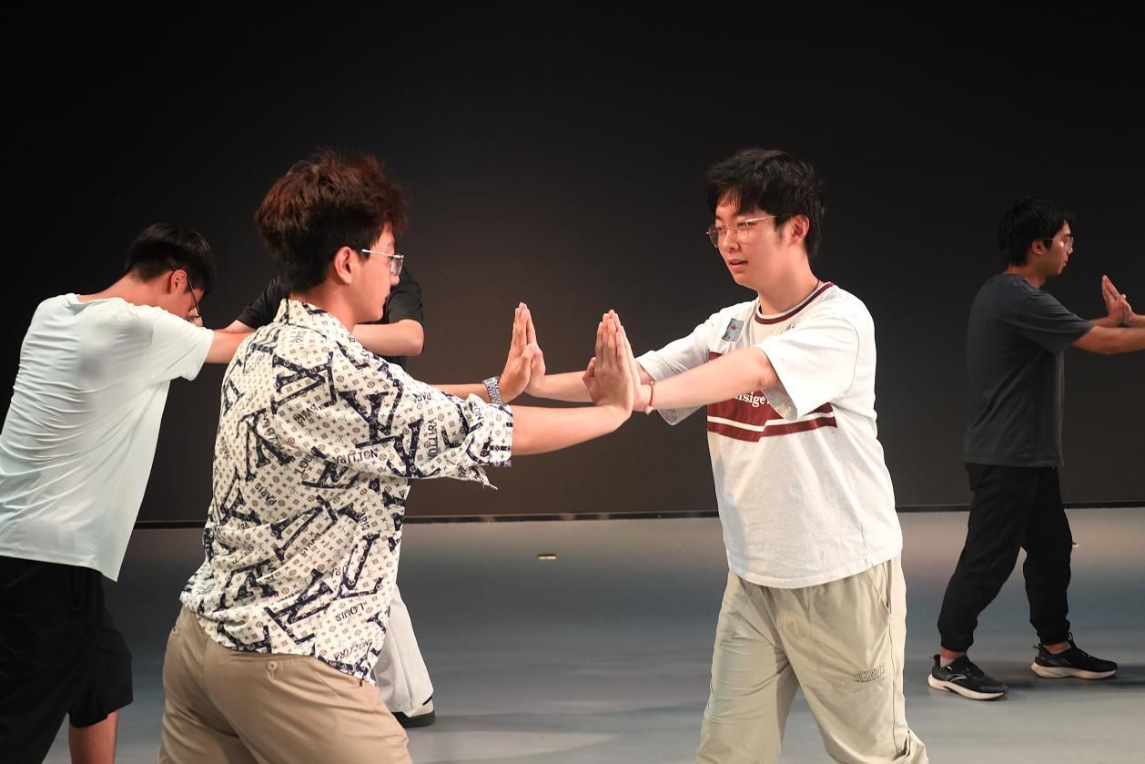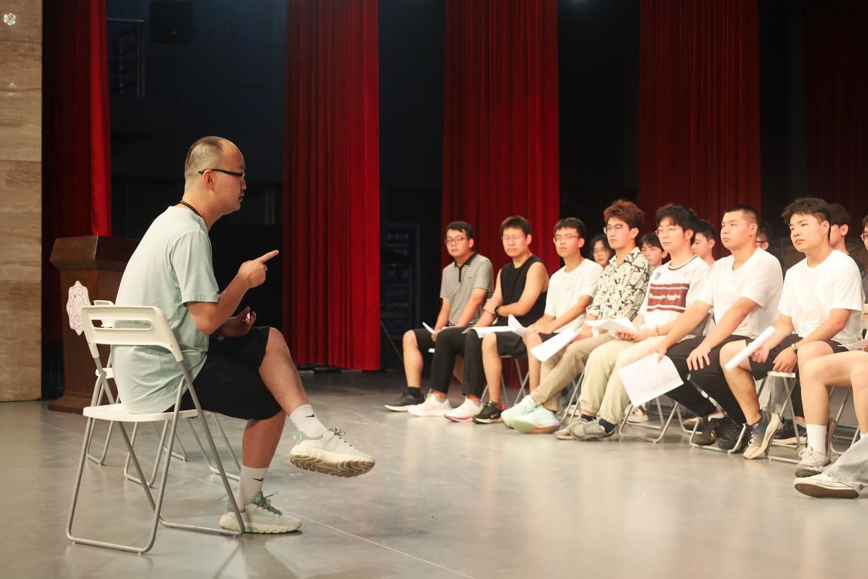 排练伊始,演员们以饱满的精神状态迎接每日的排练挑战。虽然许多同学首次接触话剧表演,但秉持严肃认真的态度,通过练习发音、绕口令、诗朗诵和形体展示等内容虚心学习表演基本功,反复打磨台词与人物表演细节。西安话剧院余燕妮导演通过游戏互动与理论讲解相结合的方式指导排练,帮助同学们放松身心、排除杂念,引导大家以自然真挚的状态融入情境,让角色精神世界更显真实丰满。余燕妮谈到:“演员的感受力训练是打好基本功的关键——真实细腻的人物和事件感受力,正是演员塑造人物、传递情感的核心‘内功’”。