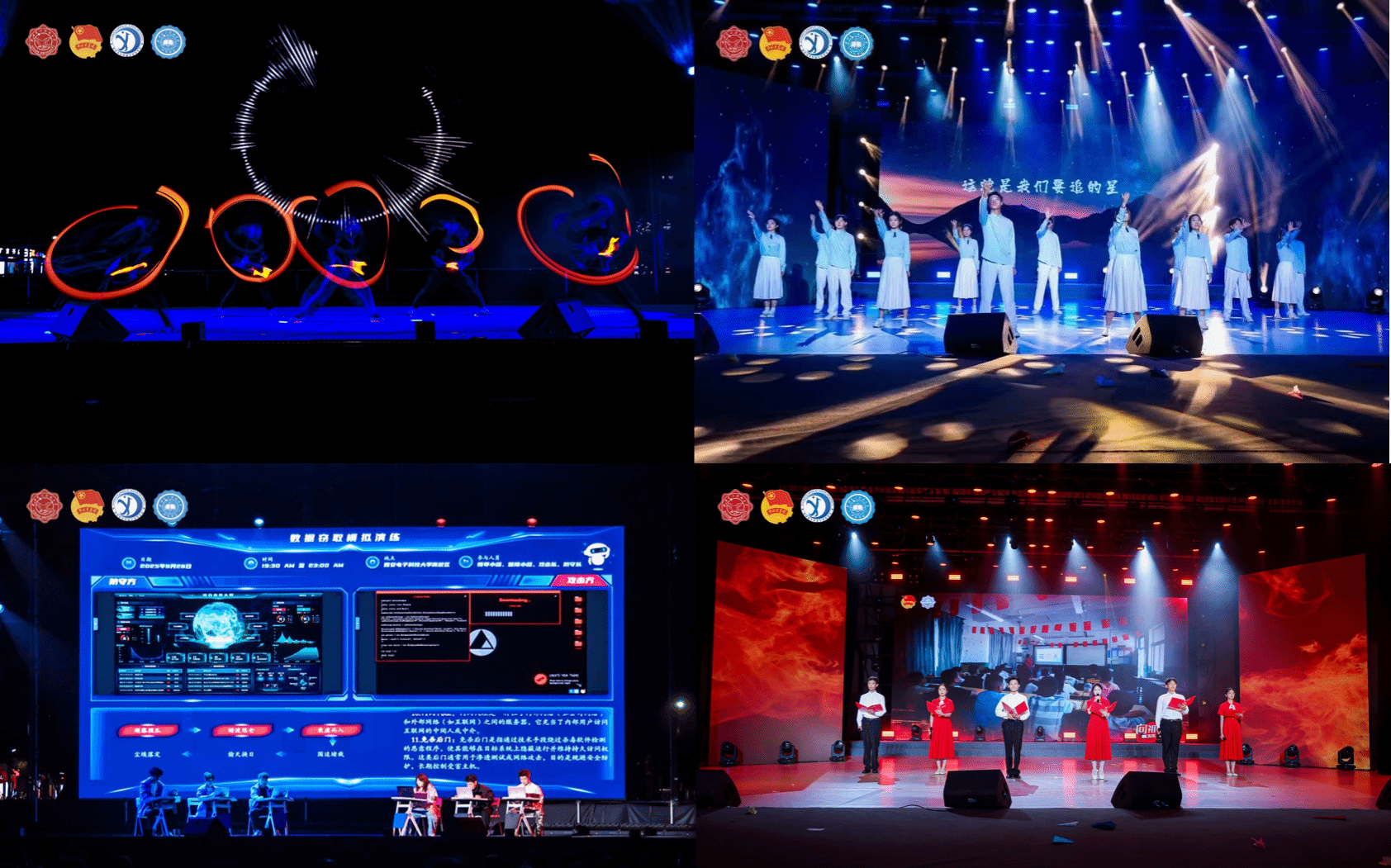 晚会聚焦青春与梦想,为新生们展示追逐梦想的广阔天地。《青春的誓言》社团成员们倾情演绎大学生活的无限可能。《向祖国报告》大学生艺术团朗诵与主持人团以朗诵形式展现西电人矢志不渝的科技报国情怀。《夜空中最亮的星》大学生艺术团合唱团用温暖的歌声传递对科技工作者的敬意,激励同学们勇攀科学高峰。《网安攻防战》信息网络技术中心通过现场模拟钓鱼攻击事件,为同学们敲响网络安全警钟;陕西省魔术家协会理事屈捷与MiracleMiracle魔术社学生共同演绎魔术《奇迹时刻》《祝愿》,介四相声社带来的《打灯谜》将欢声笑语带给全场。夏天音乐社、大学生艺术团、TON乐团及校歌赛十强歌手轮番登台,从深情的乐队演奏到充满故事感的独唱,每首歌都引起共鸣,引发大合唱。来自IDOL舞社、B-Force街舞社、Shining动漫社的同学们,把年轻的朝气洒满舞台,感染着台下每一颗跳动的心脏,令台下尖叫不断。这些节目各具特色,共同构成这场主题鲜明、创意无限的迎新晚会,为新生们开启充满希望与梦想的大学生活新旅程。